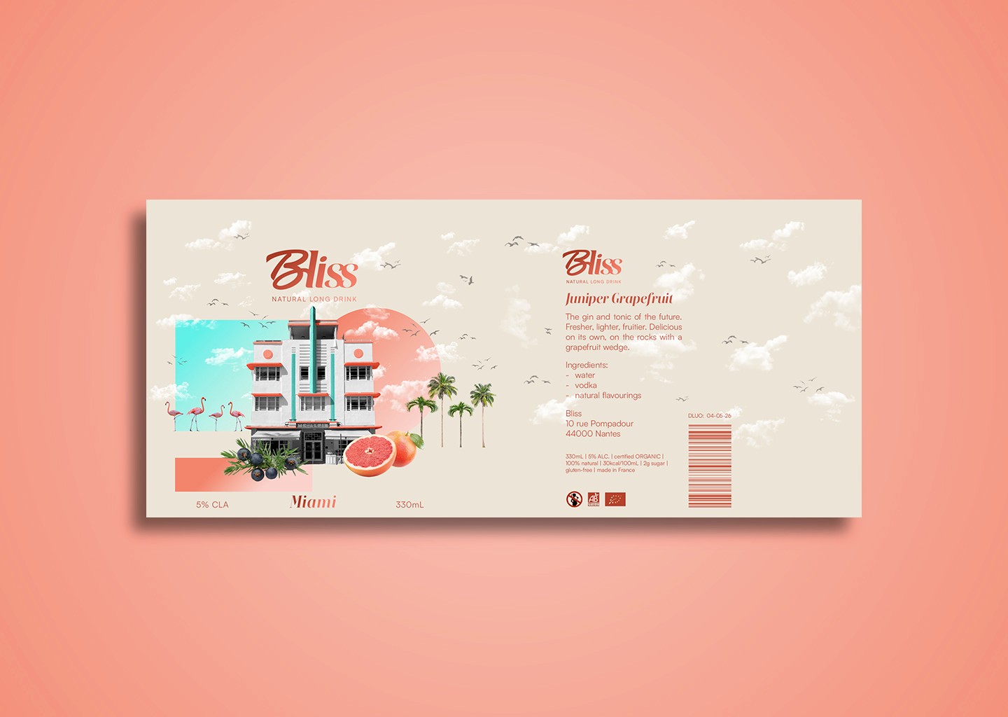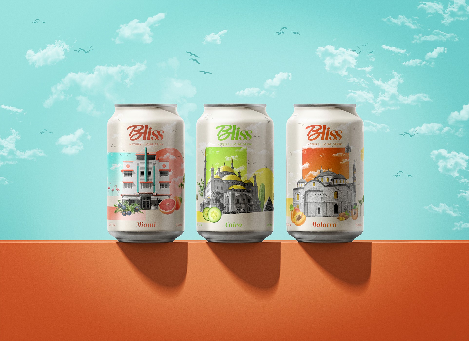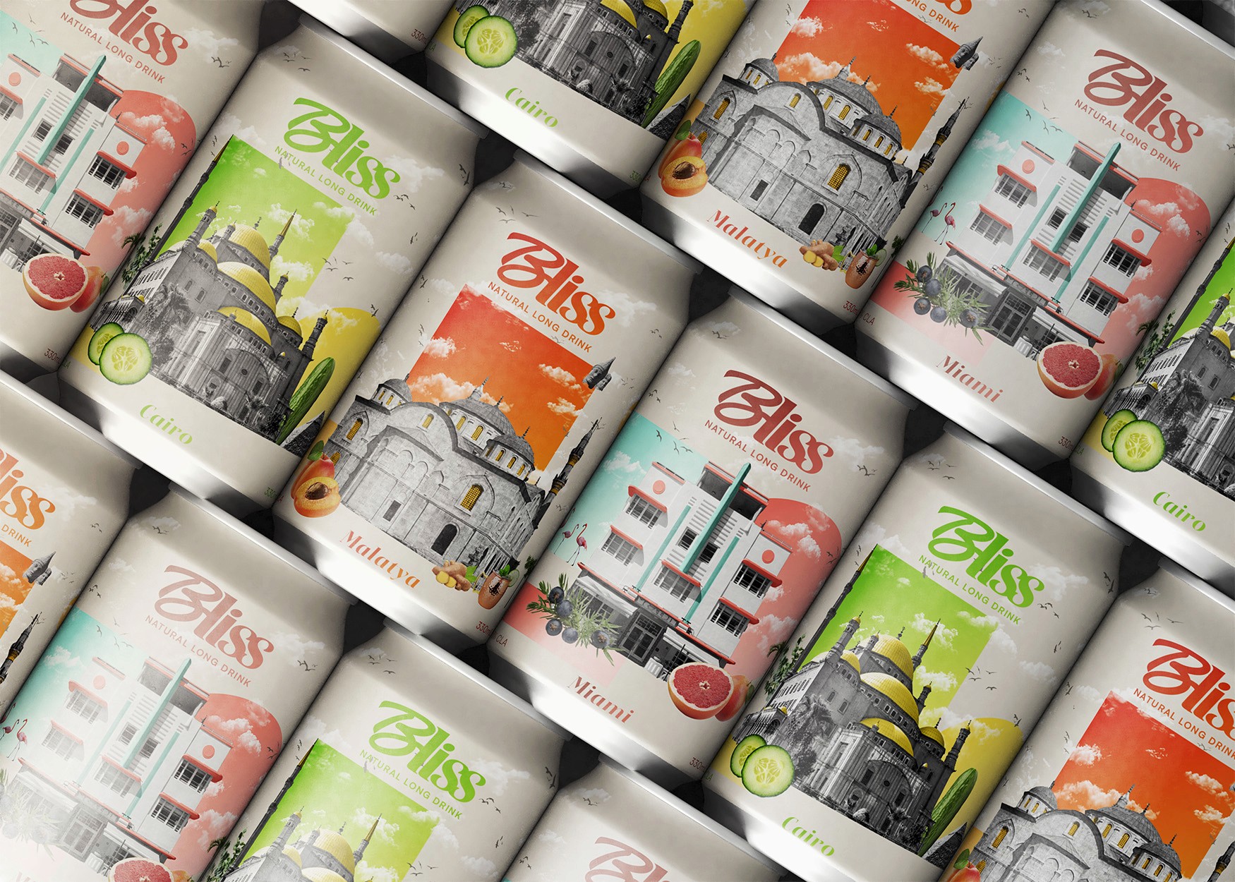Bliss is a range of three cocktail cans inspired by the idea of traveling through taste. Each flavor is paired with a city whose culture or history resonates with its ingredients, creating a sensory journey that connects flavor and destination. The project explores how visual identity can enhance this storytelling by immersing the consumer in a unique atmosphere for each recipe.
