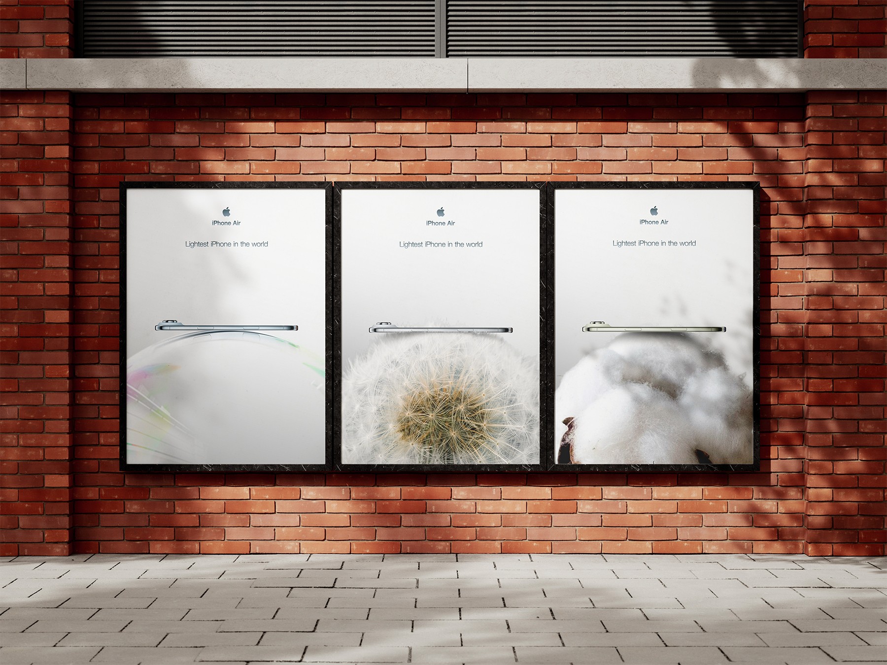 For this project, I chose to highlight the lightness of the iPhone Air by placing it on unusually fragile supports such as a soap bubble, a dandelion, and a cotton flower. Each image uses a minimal and airy composition to visually express how little weight the device carries. For the street-marketing extension, the goal is to push the concept into a real, physical experience: inside an Apple Store, the iPhone appears to float in mid-air thanks to an electromagnetic system.